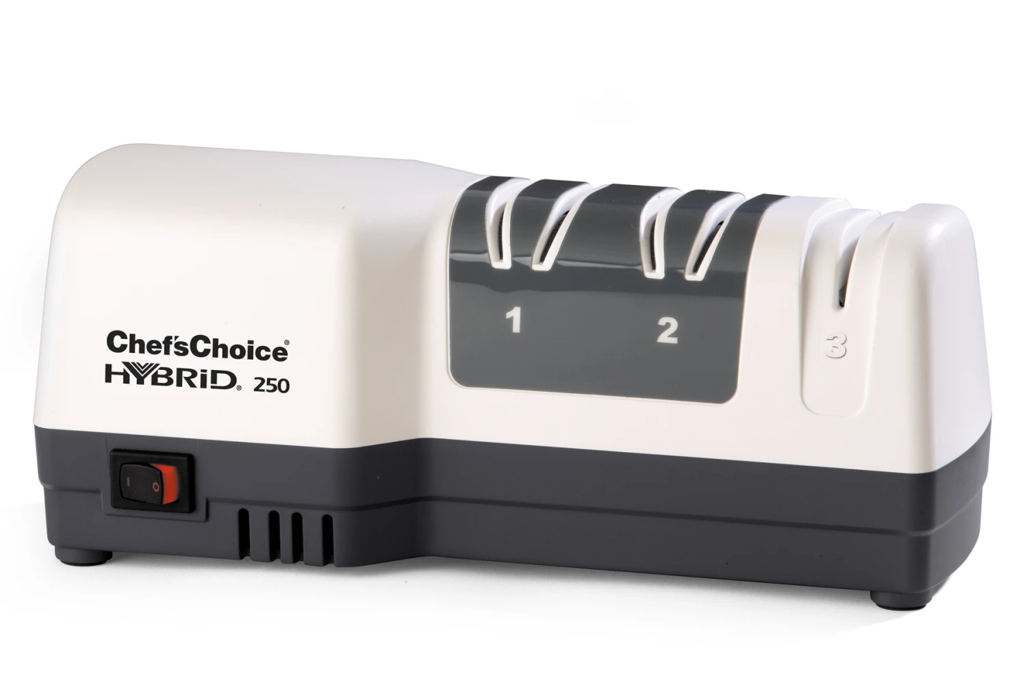 The Chef’s Choice Hybrid #250 Sharpener is a value-priced 3-stage 20° sharpener appropriate for even the dullest knives. What makes it a hybrid is that it combines 2 motorized stages and 1 manual stage. The hybrid technology provides a good value electric sharpener at a low price point.