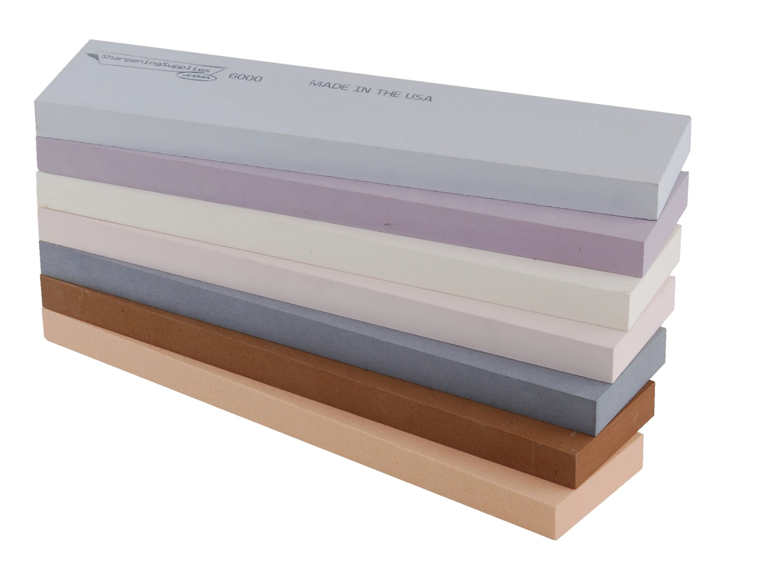 We made certain that they covered a wide range of grits. As such, we offer them from an aggressive 220 right up to a polishing 8000 at well-spaced intervals. The available grits are: 220, 400, 600, 800, 1000, 3000, and 6000. It’s unlikely that you will need every stone in that range, but rest assured you can find a complete set, whatever your needs may be.
