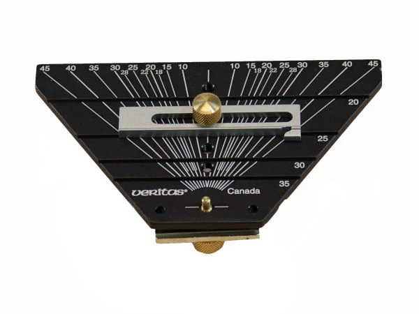 The Skew Registration Jig is used in conjunction with the Veritas Mk. II Honing Guide. It provides a reference for setting the blade in the honing guide, allowing you to sharpen skew chisels or plane irons to precise angles and do so repeatedly.