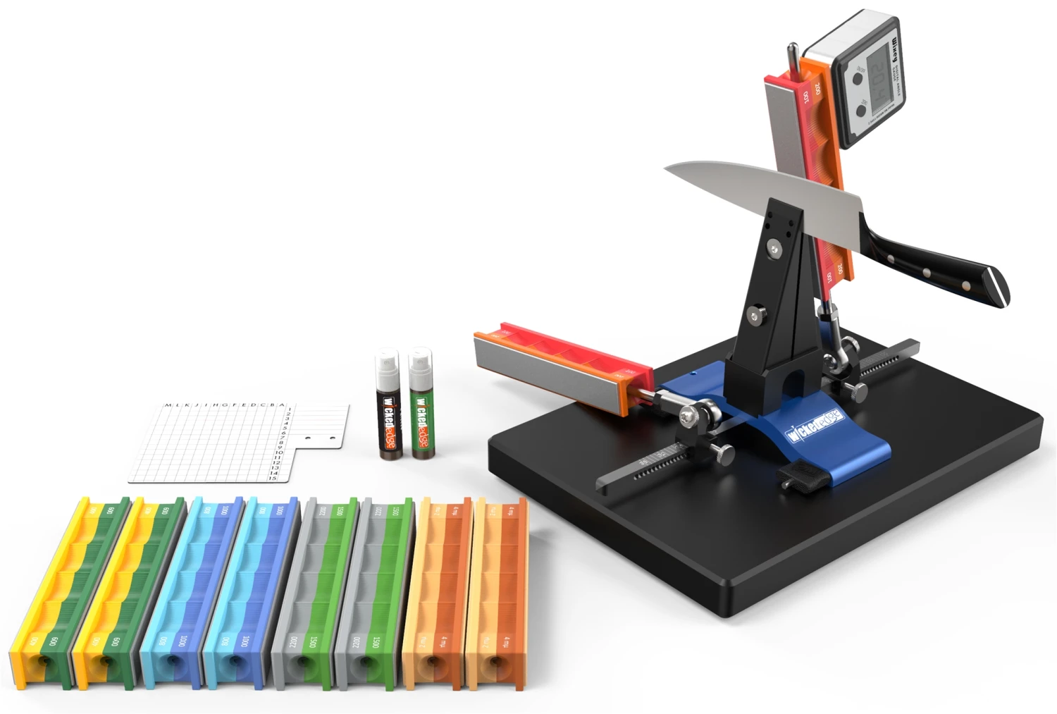 The Wicked Edge Pro Pack 2 features hardware for possible angles to 13°-35° and micro adjustability down to .05°. Combined with a aluminum base, digital angle gauge and a comprehensive of grits, ceramic hones and strops with compound, the Pro Pack 2 is a complete package indeed.